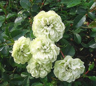 Роза миниатюрная, высота растения во время цветения – 140 см. Листья очень красивые, распускаются имея бронзовую окраску, потом постепенно зеленеют и выдают рельефное жилкование. Цветки мелкие белого цвета с розоватым оттенком, душистые, собраны в крупные разветвленные соцветия, возвышающихся над листьями. Период цветения около месяца в середине лета.
